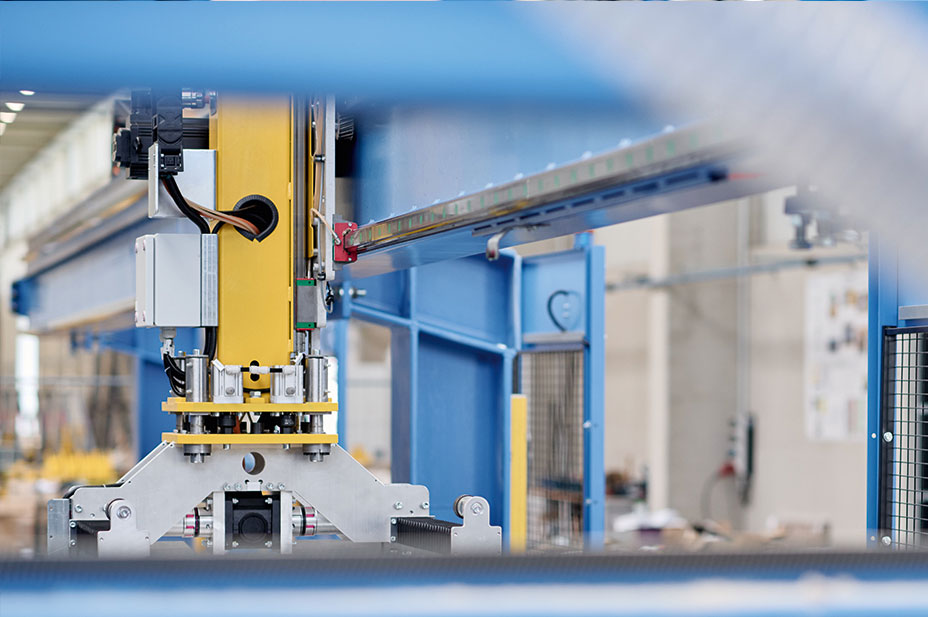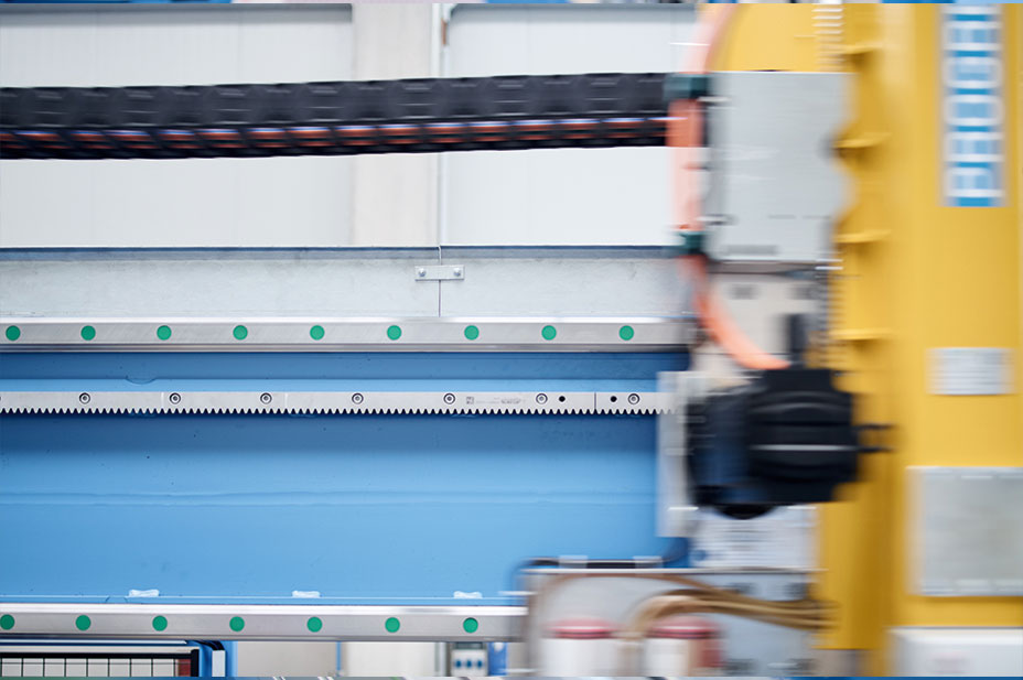 Linear axes with a total stroke length of 14 meters and 25 meters of linear guideways, combined with a rack and pinion drive, achieve the dynamic movements required for the minimum cycle times.